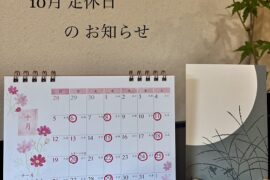 10月 定休日のお知らせ 【10月 定休日のお知らせ】 今月のお休みは、水曜、土曜(1週目は営業)、第1,第3月曜日、24(金)とさせていただきます。 また、ご予約状況に応じてお休みをいただく事があるかと思いますが、何卒よろしくお願いします。 ・…Read More » Posted on 2025年10月1日2025年10月1日 by yanagida Categories: 定休日のお知らせ